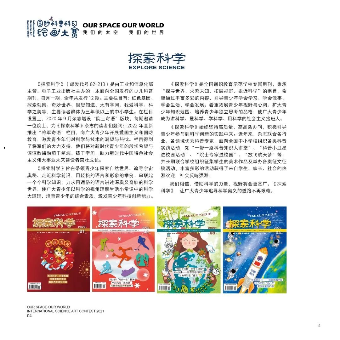 《探索科学》杂志是经国家新闻出版总署批准发行的国家级主题拓展探究式科普期刊,世界美育、笔墨中国、国际科普科幻绘画大赛携手《探索科学》杂志开辟《科学之美》专栏,以期用艺术激发青少年的科学兴趣,点亮科学梦想,同时丰富孩子们的创作题材,为世界美育注入新鲜的活力。目前《科学之美》栏目已展示27期。