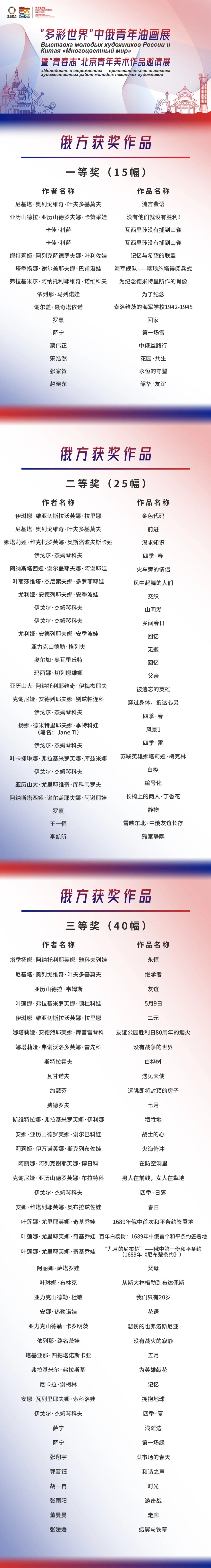 “多彩世界”中俄青年油画展暨“青春志”北京青年美术作品邀请展自4月份启动以来,共收到中俄油画作品460幅。经过专家评审和组委会终审,最终评选出俄罗斯获奖作品80幅,中国获奖作品80幅,"青春志"入展作品51幅,优秀组织单位8家。现公布获奖名单。