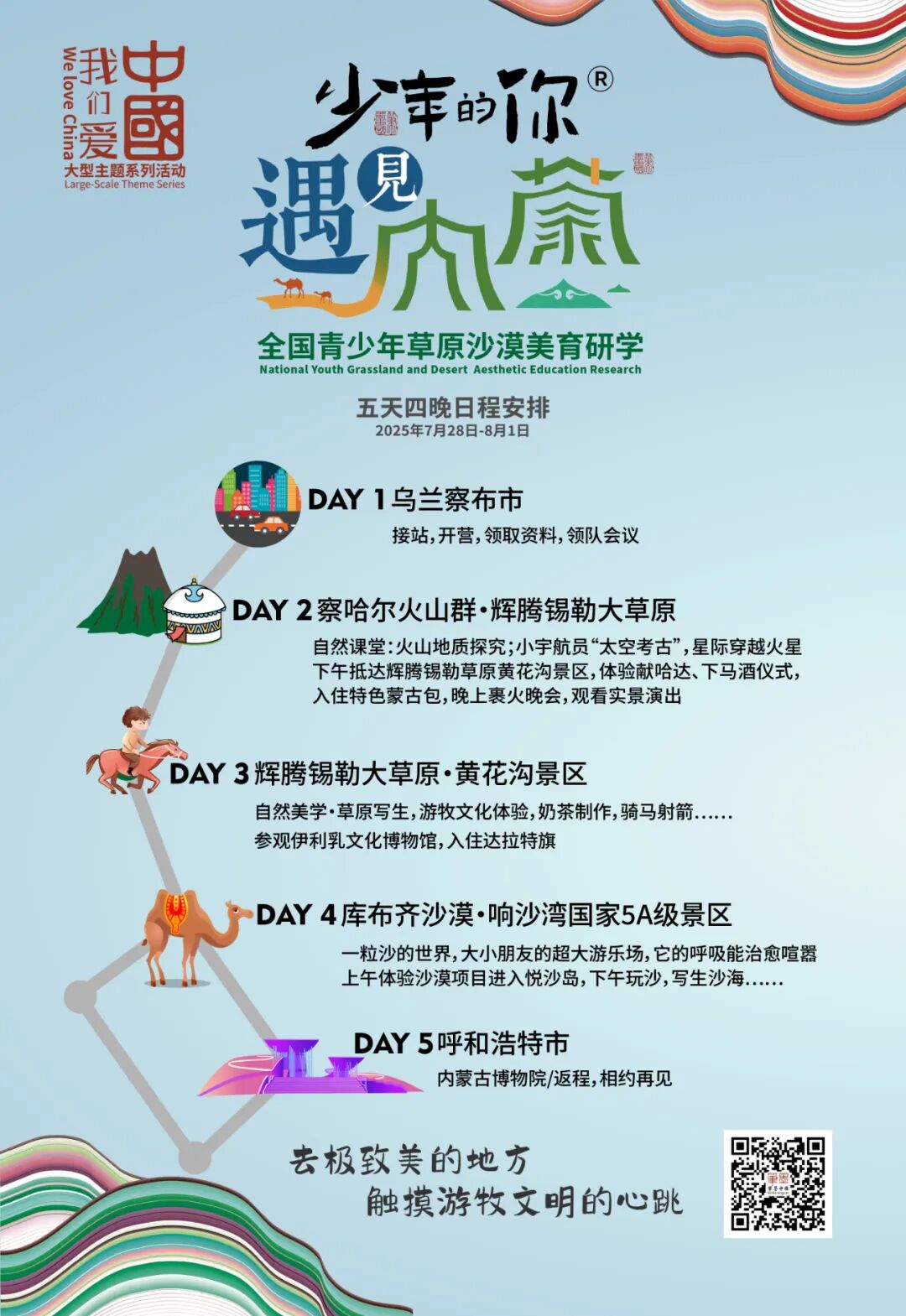 3.“知、行、见、美”课程体系,带着研学知识、目标和问题去研学,通过项目式探究和体验实践,发现美、浸润文化、探究自然、拓展见识,在“知、行、见、美”中感受“游牧文明”和“草原沙漠火山”自然课堂的魅力,在浸润中提升跨学科解决问题的能力。