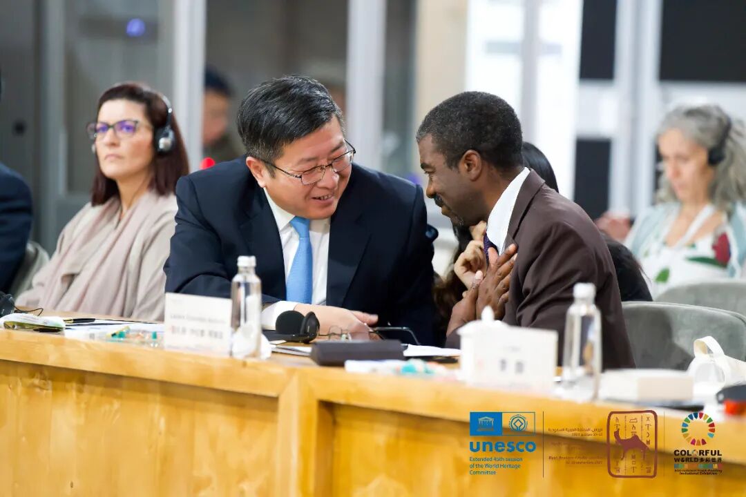 ▲北京市副市长谈绪祥与联合国教科文组织世界遗产中心主任拉扎赫·伊伦都·阿索莫在边会期间交流。