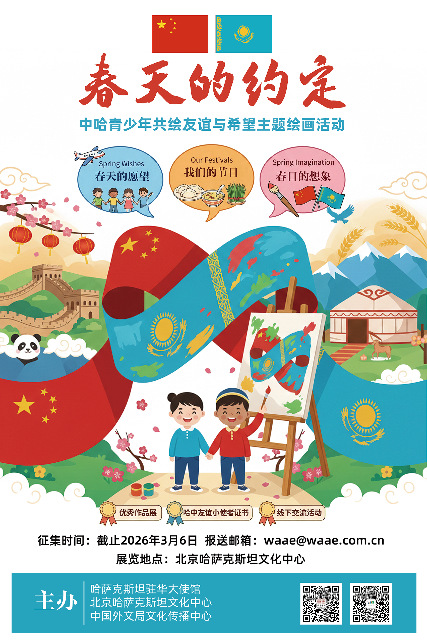 Inquiry methods 如有任何疑问或需进一步了解活动详情,欢迎通过以下方式联系咨询: 咨询电话 010-52881399 手机/微信13901222653 18601304321 期待您的参与,让我们用画笔传递中哈友谊与希望,描绘一个充满春日暖意的美好未来! Inspiration Mini-Lesson 【纳乌鲁斯节:哈萨克斯坦的春节】 每年3月21日前后,当春风越过雪山、染绿草原,哈萨克斯坦人民将迎来他们最重要的传统节日——纳乌鲁斯节。纳乌鲁斯节象征新的开始、和平、友谊和希望。人们打扫房屋,穿民族服装,互相祝福。在哈萨克斯坦,节日期间大家一起吃传统食物纳乌鲁斯粥(Nauryz koje),还会有音乐、舞蹈、民族游戏和家庭聚会。 近几年,哈萨克斯坦采用了新的庆祝方式,叫“纳乌鲁斯纳玛”。庆祝活动持续 10天(3月14日—3月23日),每天都有不同的主题,比如:问候、慈善、家庭、文化、民族服饰、体育和环保等。纳乌鲁斯节不仅是家庭团聚的日子,更是友谊绽放的时刻。哈萨克斯坦人会在这天与朋友共同做许多有意义的事: 1.共备“纳乌鲁斯粥”,分享祝福 家人和朋友们常常聚在一起,亲手熬制象征团结与丰收的“纳乌鲁斯粥”。这种粥用小麦、大米、豆子、肉、盐、奶、水等七种食材制成,每一种都代表美好的寓意。 2.互赠礼物,传递春的问候 人们会为朋友准备小礼物,比如手工刺绣的手帕、甜点、春天的第一束花,或是象征生命的麦苗。礼物虽不贵重,却承载着对友谊的珍视与对朋友新一年的祝福。 3.携手布置“达斯特尔汗”迎春长桌 朋友们互相协助,在家或社区布置节日的“达斯特尔汗”(长桌宴)。桌上铺满绣花餐布,摆满馕、奶酪、果干、巴吾尔萨克(油炸面团)等美食,中间放置嫩绿的麦芽,象征生命的复苏。大家围坐共餐,举杯祝愿友谊长存。 纳乌鲁斯节中的自然情怀 哈萨克人认为,春天是所有生命重新缔结契约的季节。因此,节日中人们还会: 植树种草,和朋友一起种下一棵树,寓意共同成长;清洁河流与家园,象征辞旧迎新;放飞鸟儿,表达对自由与和平的向往…… 【中国春节:阖家团圆的年节盛宴】 每年农历正月初一前后,当冬雪消融、万物萌动,中国人民迎来最重要的传统节日——春节,也叫“过年”。春节象征辞旧迎新、团圆和美、福运安康。人们洒扫庭除,穿新衣戴新帽,互相拜年祝福。在中国,节日期间全家共享丰盛的年夜饭,品尝饺子、汤圆等传统美食,还会举行贴春联、挂灯笼、舞龙舞狮等丰富多彩的节庆活动。 中国的春节就像哈萨克斯坦的纳乌鲁斯节一样,是辞旧迎新、家庭团聚、祈愿美好的隆重节日!中国春节的庆祝活动从腊月延续至元宵(约持续15—20天),每天都有不同的主题与习俗:除夕·团圆守岁——全家围炉夜话,共享年夜饭,长辈赠压岁钱,守岁至天明;正月初一·新春贺岁——穿新衣、放爆竹,拜年祈福;正月十五·元宵灯会——赏花灯、猜灯谜、吃汤圆,万家灯火中圆满收年……春节标志着春天的开始,也承载着中国人对温暖和幸福的期盼。 春节里有什么好玩的? 1. 吃“年夜饭”:全家人围坐一起,享用丰盛的年夜饭。年夜饭通常是北方吃饺子,南方吃汤圆,象征着团团圆圆。你能想象这一桌有多少种味道吗? 2. 贴春联、挂灯笼:家家户户在门上贴红纸写的春联,挂起红灯笼,迎接福气。 3. 发红包:长辈会给孩子们发“压岁钱”,装在红色信封里,祝福他们平安长大。 4. 舞龙舞狮:春节中国街头常有热闹的舞龙舞狮表演,锣鼓声中,金龙和金狮跳跃腾挪,带来吉祥与欢乐! 春天的中国:万物复苏的画卷 冰雪消融后,中国大地渐渐苏醒:柳树发芽,桃花绽放,燕子从南方飞回。人们踏青赏花、放飞风筝,在春风中感受生命的萌动。如果你在春天来中国,可能会看到:江南水乡的油菜花田像金色的海洋,孩子们在田间奔跑;北方公园里爷爷奶奶打太极、唱京剧,与春光一同舒展;家家户户打开窗户,晒被子、腌春菜…… 春节与纳乌鲁斯节的对话 虽然一个在白雪渐融的正月 一个在春分时节的草原 但中国的春节和哈萨克斯坦的纳乌鲁斯节 都藏着人们对春天同样的热爱 我们都用丰盛的食物表达祝福 (饺子与纳乌鲁斯粥) 我们都用红色与绿色装点家园 (春联与麦苗) 我们都相信春天是 友谊与希望开始的季节 小朋友们可以打开脑洞 乘着想象的翅膀 画出你心中的中哈友谊
